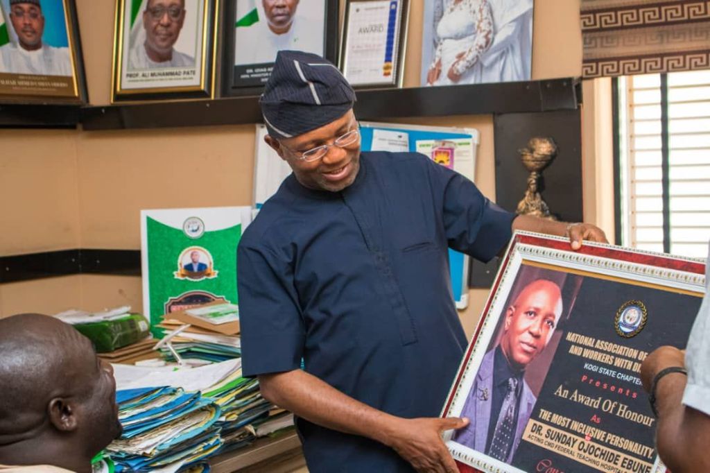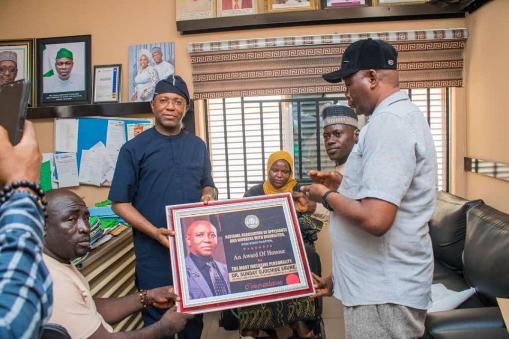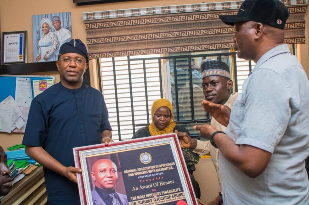 The National Association of Applicants and Workers with Disabilities, Kogi State Chapter, has honoured Acting Chief Medical Director of Federal Teaching Hospital Lokoja,, Dr. Sunday Ojochide Ebune, for his remarkable efforts in promoting disability-inclusive recruitment practices.